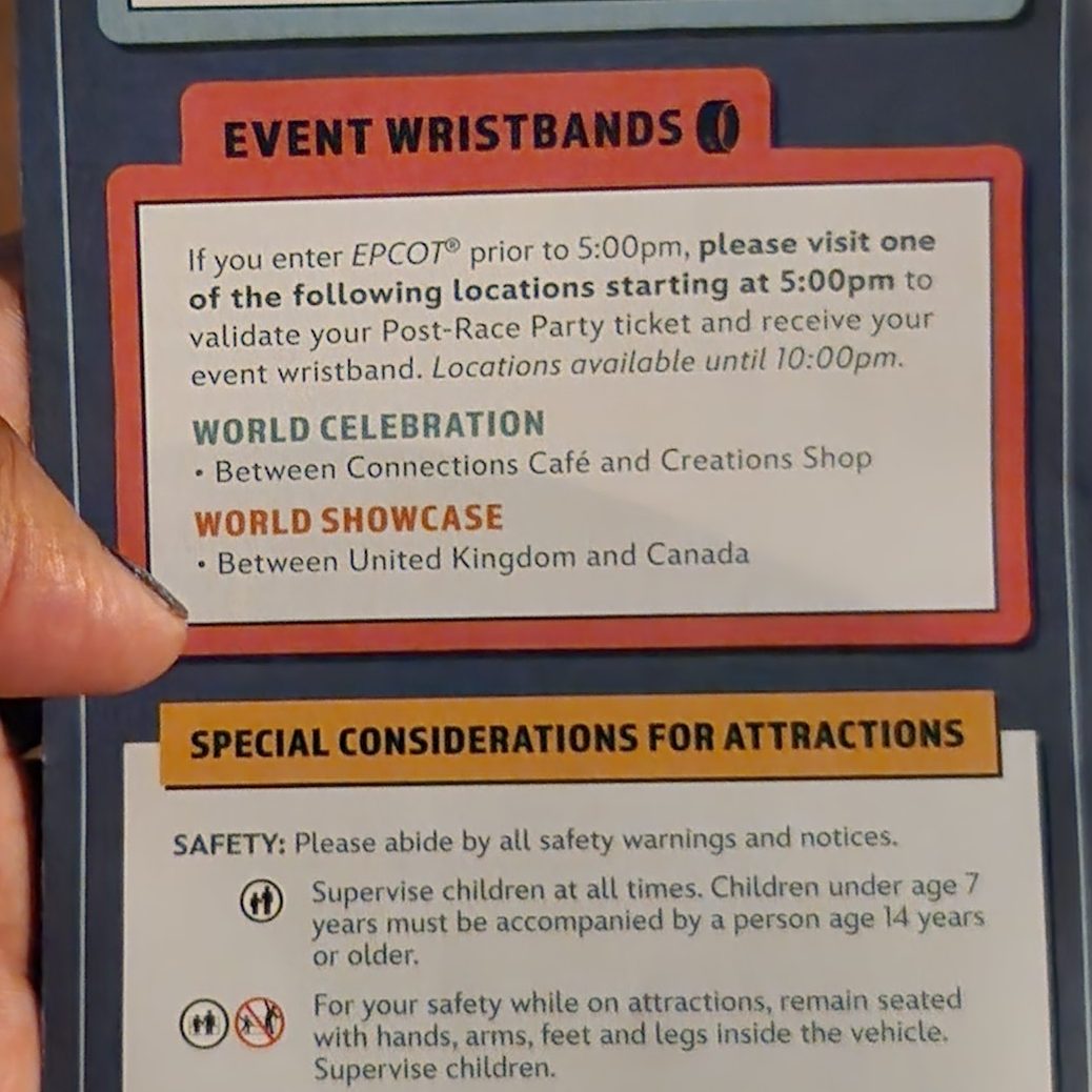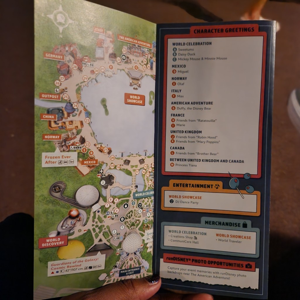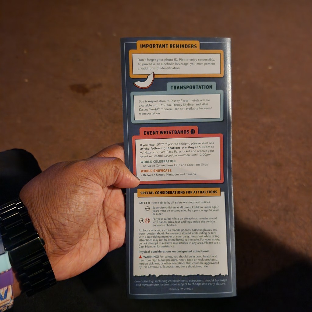 Nights in Florida can be warm, but early mornings may feel cool. If you run in costume or layers, bring a throwaway item you can shed. Pick something easy to remove zippers, Velcro, etc.. In 2023, the morning was cold, and I was unprepared. However, in 2024, the morning was warm, and was too prepared for the cold. - Plan for the course pace